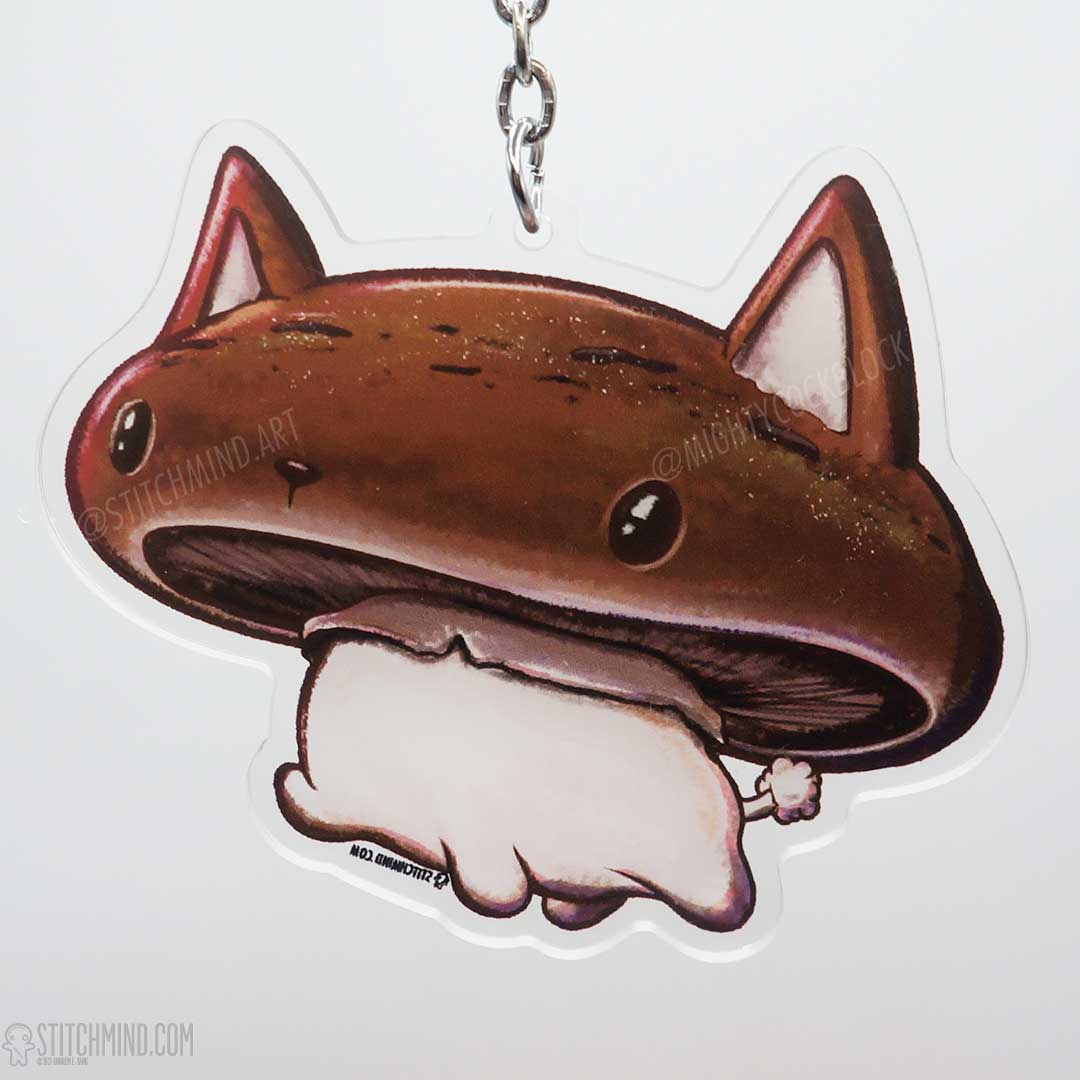 A clear Acrylic charm of Mewshroom! About 3 inch tall by 3 inch wide. Double Sided with art on both sides. Brown cap on both sides. Come with keychain clasp with a silver plastic clip hook.
